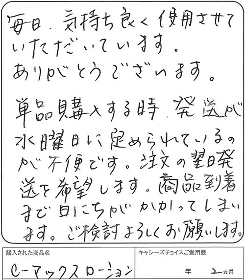 毎日、気持ち良く使用させていただいています。ありがとうございます。単品購入する時、発送が水曜日に定められているのが不便です。注文の翌日発送を希望します。商品到着まで日にちがかかってしまいます。ご検討よろしくお願いします。