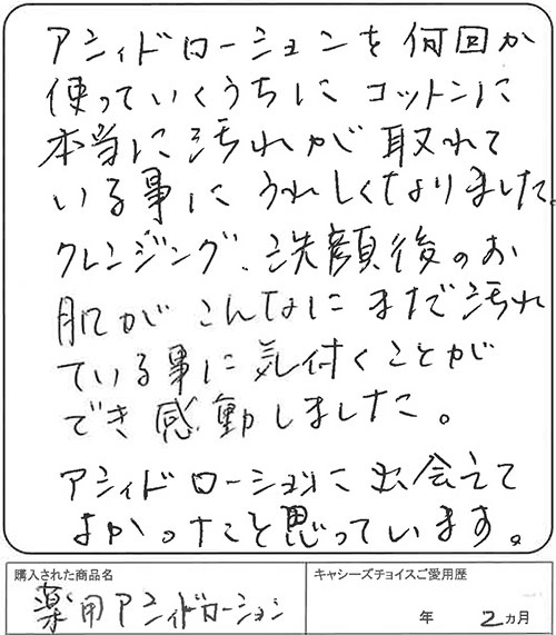 アシィドローションを何回か使っていくうちにコットンに本当に汚れが取れている事にうれしくなりました。クレンジング、洗顔後のお肌がこんなにまだ汚れている事に気付くことができ感動しました。アシィドローションに出会えてよかったと思っています。