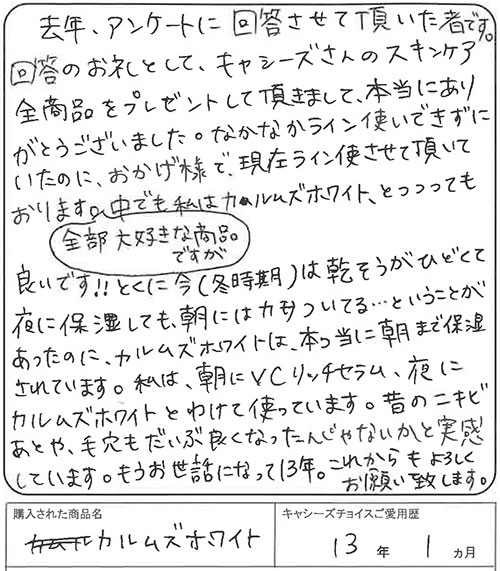 去年、アンケートに回答させて頂いた者です。回答のお礼として、キャシーズさんのスキンケア全商品をプレゼントして頂きまして、本当にありがとうございました。なかなかライン使いできずにいたのに、おかげ様で現在ライン使させて頂いております。(全部大好きな商品ですが)中でも私はカルムズホワイト、とっっっても良いです!!とくに今(冬時期)は乾そうがひどくて夜に保湿しても、朝にはカサついてる…ということがあったのに、カルムズホワイトは本っ当に朝まで保湿されています。私は、朝にVCリッチセラム、夜にカルムズホワイトとわけて使っています。昔のニキビあとや、毛穴もだいぶ良くなったんじゃないかと実感しています。もうお世話になって13年。これからもよろしくお願い致します。