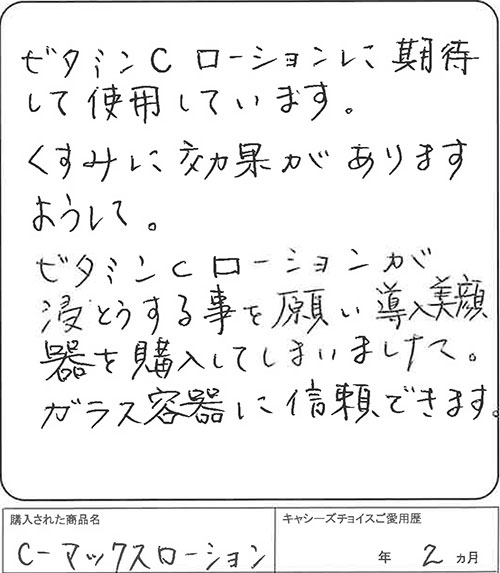 ビタミンCローションに期待して使用しています。くすみに効果がありますように。ビタミンCローションが浸とうする事を願い導入美顔器を購入してしまいました。ガラス容器に信頼できます。