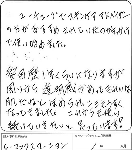 ユーチューブでスキンケアアドバイザーの方がおすすめされていたのがきっかけで使い始めました。愛用歴1年くらいになりますが、周りから透明感があってきれいな肌だねとほめられ、シミもうすくなってきました。これからも使い続けていきたいと思っています!